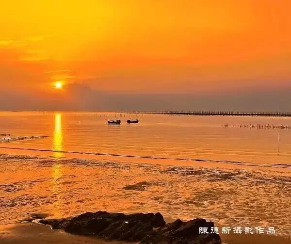 海面上的點點漁船和近海養殖網箱,在朝陽的映射下,波光粼粼,熠熠生輝。