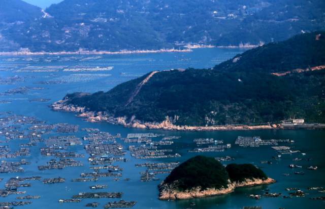 廣袤無垠的海面上兀立著幾座島嶼,還點綴著點點白色的浮標,與近處停泊的漁船相映襯。